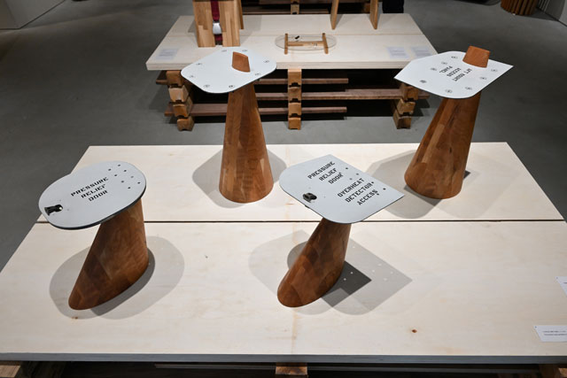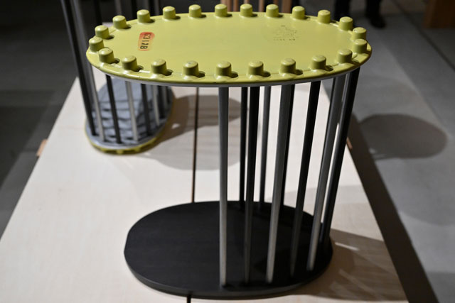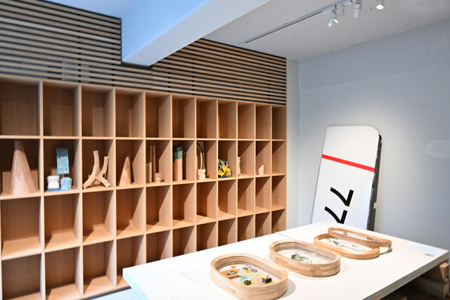 前回は金属製の点検ハッチに木製の脚を取り付けたサイドテーブルや、機体外側窓を座面に用いたスツールなど13点を出品。今回は商品を追加して展示している。展示ディレクターは建築家の芦沢啓治氏が務め、会場・グラフィックデザインをデザイナーのイトウケンジ氏が手掛けた。