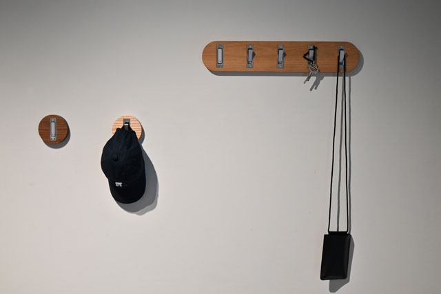カリモクのギャラリーに展示されたJALの退役777の部品をアップサイクルしたインテリア。777のギャレーにあったラッチを活用したもの=23年9月15日 PHOTO: Tadayuki YOSHIKAWA/Aviation Wire
