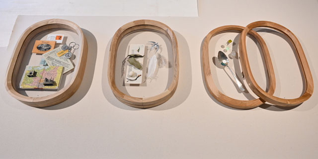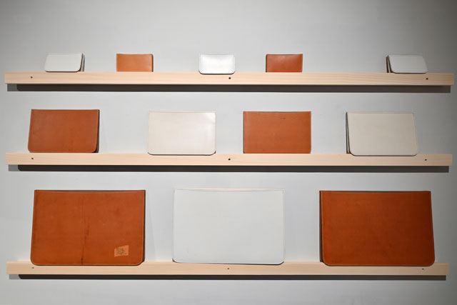カリモクのギャラリーに展示されたJALの退役777の部品をアップサイクルした小物=23年9月15日 PHOTO: Tadayuki YOSHIKAWA/Aviation Wire