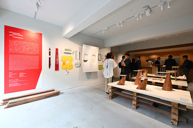 JALグループは退役したボーイング777型機をリサイクルやアップサイクルし、廃棄物の削減を進めている。今回のイベント「Upcycling Airplanes JAL | Karimoku」では、今年6月に東京ビッグサイトで開催された「インテリア ライフスタイル 2023」と同様、777の部品を再利用し、デザイナーたちが木と組み合わた作品を考案した。