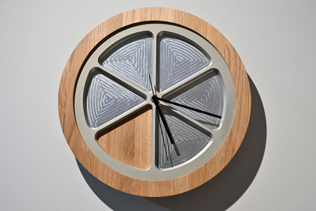 カリモクのギャラリーに展示されたJALの退役777の部品をアップサイクルした時計=23年9月15日 PHOTO: Tadayuki YOSHIKAWA/Aviation Wire