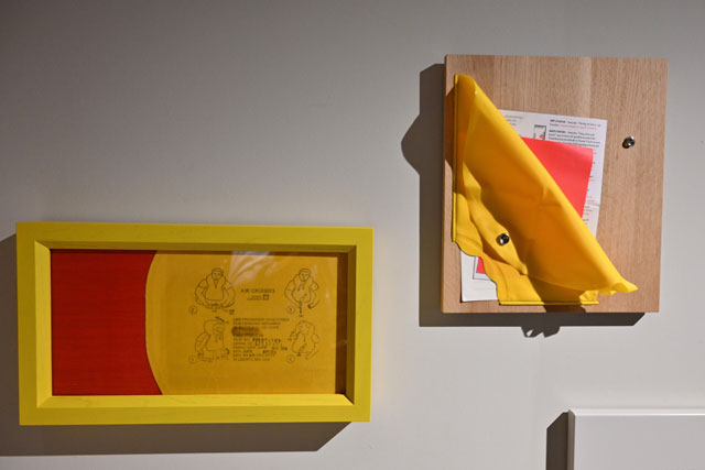 カリモクのギャラリーに展示されたJAL機のライフベストをアップサイクルしたインテリア=23年9月15日 PHOTO: Tadayuki YOSHIKAWA/Aviation Wire