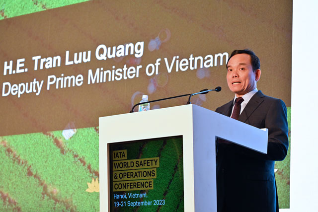 ハノイで開幕したIATAの第1回WSOCに登壇するチャン・ルー・クアン副首相=23年9月19日 PHOTO: Tadayuki YOSHIKAWA/Aviation Wire