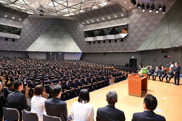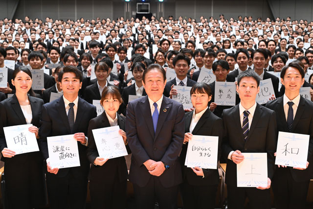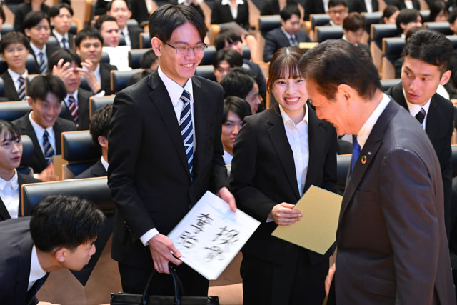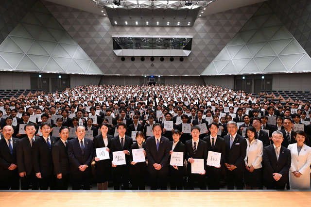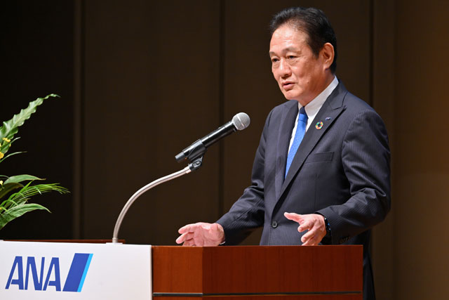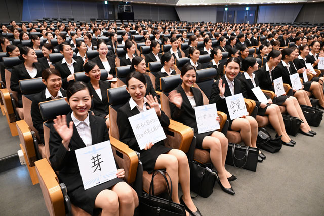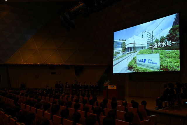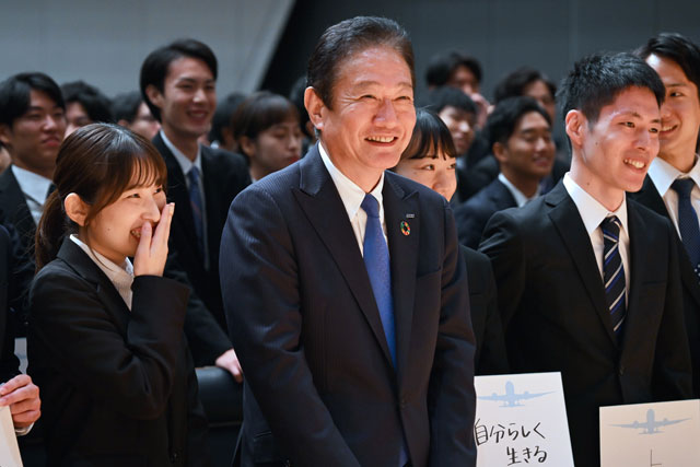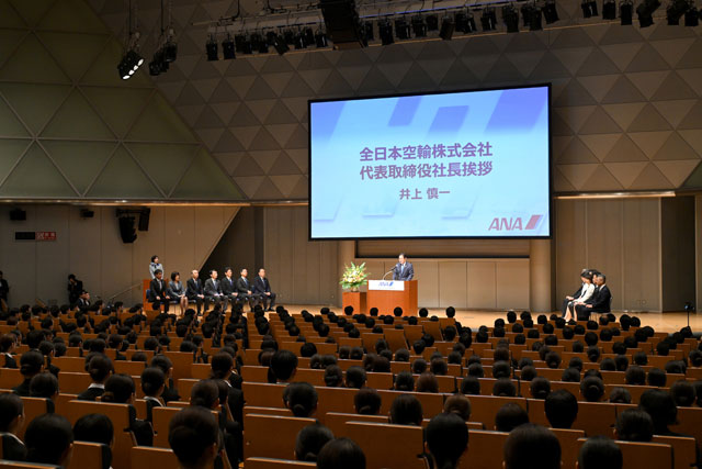 ANAの井上慎一社長は「世界に勝ちにいく機会が来た。社員にいつも言っているが、どうせやるなら明るく楽しく。暗い顔でやってもうまくいかない。ぜひ仲間に加わって欲しい」と内定者を激励した。
