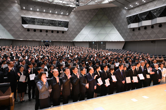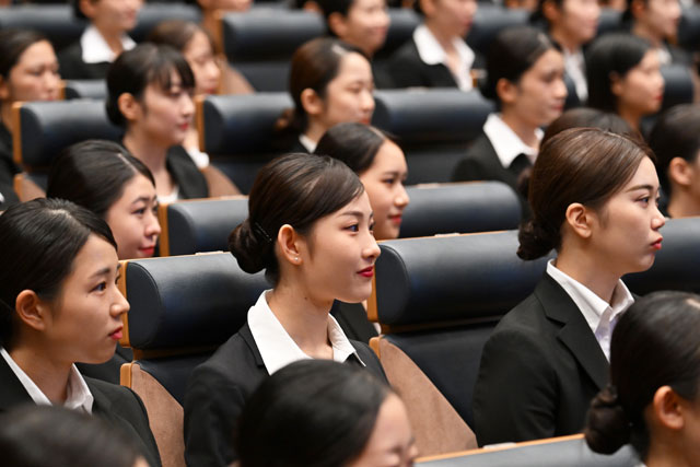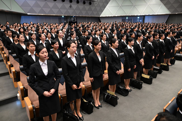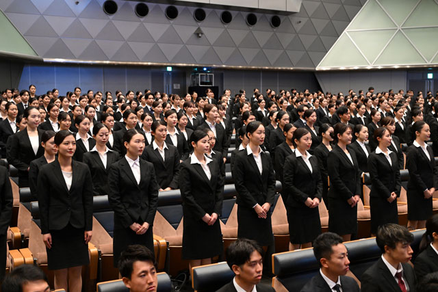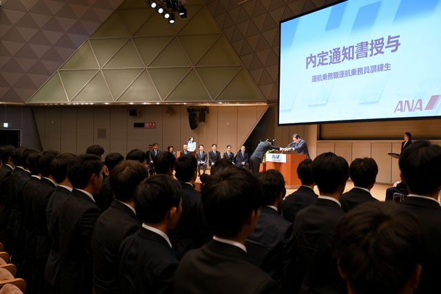 新卒者を主な対象にしたビッグサイトでの内定式は、2019年度入社の新入社員を対象にした2018年以来5年ぶり。客室乗務員は4年ぶりの出席となった。