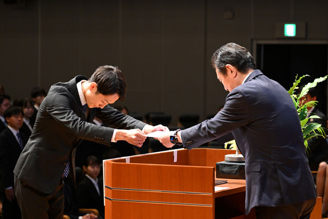 ANAの内定式で井上慎一社長(右)から内定通知書を手渡されるグローバルスタッフ職の宇田翔馬さん=23年10月1日 PHOTO: Tadayuki YOSHIKAWA/Aviation Wire