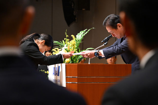 ANAの内定式で井上慎一社長から内定通知書を手渡される内定者=23年10月1日 PHOTO: Tadayuki YOSHIKAWA/Aviation Wire