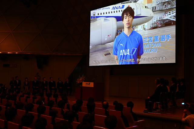 ANAの内定式にビデオメッセージを寄せたサッカー日本代表の三笘薫選手=23年10月1日 PHOTO: Tadayuki YOSHIKAWA/Aviation Wire