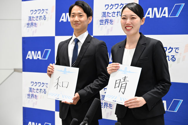 ANAの24年度入社内定式に出席したグローバルスタッフ職の宇田翔馬さん(左)と客室乗務職の料冶葵さん=23年10月1日 PHOTO: Tadayuki YOSHIKAWA/Aviation Wire