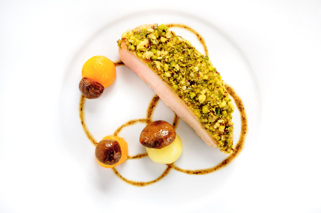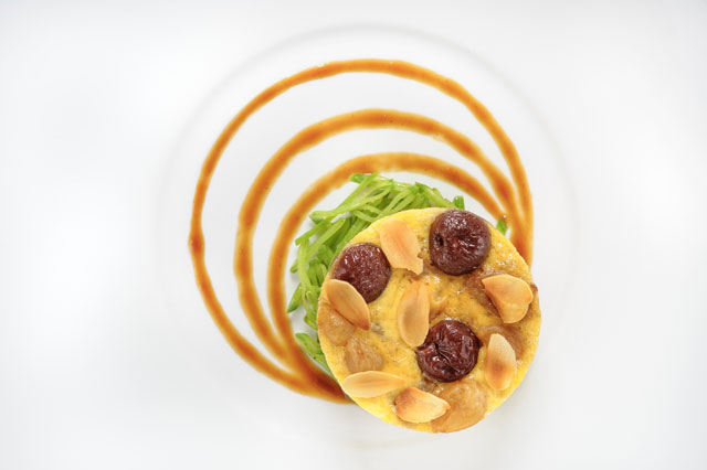 ホロホロ鳥はマンディアン風(色々なナッツ、ドライフルーツを乗せたチョコレート)の衣をまとい、南フランスのクリスマスの伝統、13のデザート(13種のナッツやドライフルーツ、果物の砂糖漬けの盛り合わせ)をイメージ。ソースは黒ラッパ茸と栗、茸を模したバターナッツ、ジャガイモにセップ茸の帽子(エールフランス提供)