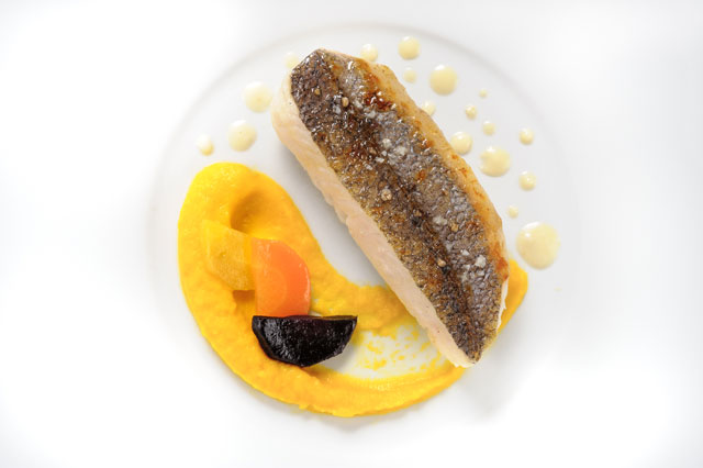 黒鱈のグリエに蜂蜜風味のニンジンのムースリーヌと色々な種類のニンジンの付け合せ(エールフランス提供)