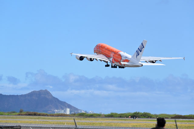 ホノルル空港を離陸するANA A380 3号機の成田行きNH181便=23年10月20日 PHOTO: Tadayuki YOSHIKAWA/Aviation Wire