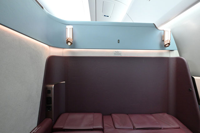 ファーストクラスは座席上のオーバーヘッドビン(手荷物収納棚)をすべてなくし、ビジネスは窓側のみとすることで開放感のある客室に仕上げた。ファーストの各席は高さ約157センチ(62インチ)の壁で仕切られており、ビジネスも約132センチ(52インチ)の壁を設けることで、個室感を高めてリビングのように過ごせるようにした。