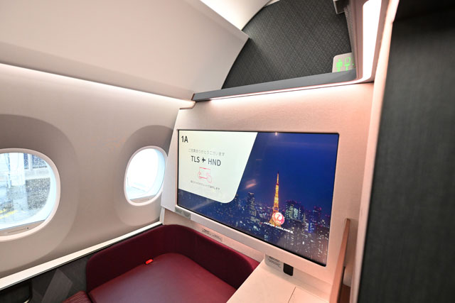 トゥールーズで初公開されたJALのA350-1000初号機の個室ファーストクラスの4K対応43インチモニター=23年12月13日 PHOTO: Tadayuki YOSHIKAWA/Aviation Wire