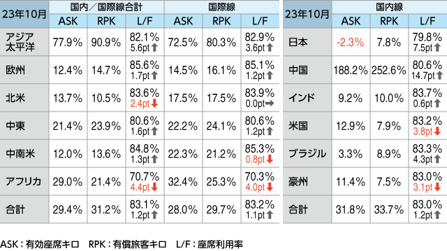 IATA(国際航空運送協会)の2023年10月世界旅客輸送実績によると、国際線と国内線の合計は、座席供給量を示すASK(有効座席キロ)が前年同月比29.4%増(19年同月比3.0%減)、有償旅客の輸送距離を示すRPK(有償旅客キロ)が31.2%増(1.8%減)となった。ロードファクター(座席利用率、L/F)は1.2ポイント上昇(1.0ポイント増)の83.1%だった。10月のRPKはコロナ前とほぼ同水準となる回復が続き、国内線は2019年同月比4.8%増で安定した戻りとなった。一方、10月はイスラエル国内で同国軍とイスラム組織ハマスによる軍事衝突が発生し、同国発着便が減便・運休となっているが、IATAは世界的な輸送量への影響がほとんどなかったとみている。