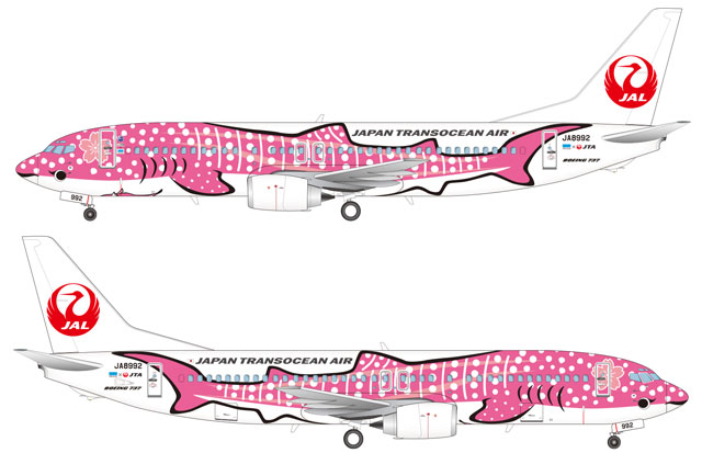 日本トランスオーシャン航空(JTA)は沖縄美ら海水族館とのタイアップで、機体にジンベエザメを描いた特別塗装機「ジンベエジェット」の2号機(ボーイング737-400型機、登録番号JA8992)を、2014年1月上旬から就航させる。