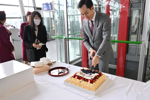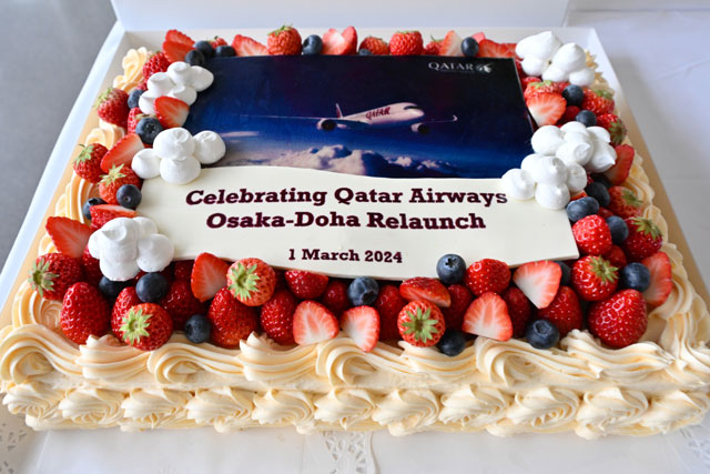 カタール航空が関空で乗客に振る舞った関西線再開を祝うケーキ=24年3月1日 PHOTO: Tadayuki YOSHIKAWA/Aviation Wire