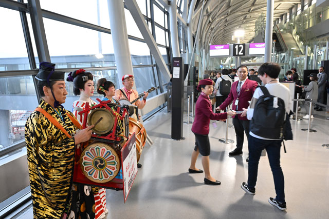 ちんどん屋が演奏する中、カタール航空の関西発ドーハ行き初便のQR803便に搭乗する乗客=24年3月1日 PHOTO: Tadayuki YOSHIKAWA/Aviation Wire