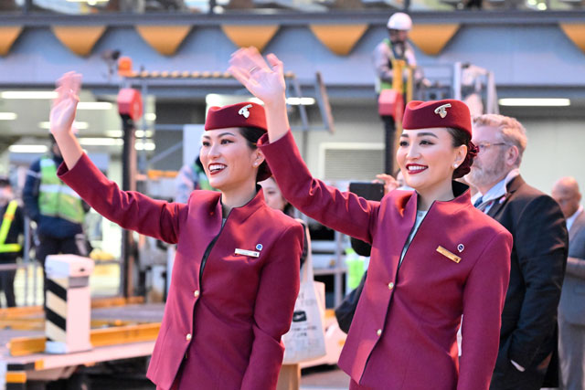 関空を出発するカタール航空のドーハ行き再開初便QR803便を見送る客室乗務員=24年3月1日 PHOTO: Tadayuki YOSHIKAWA/Aviation Wire