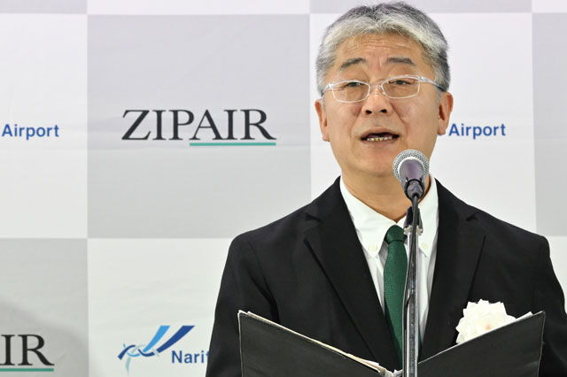 成田空港で開かれたバンクーバー線就航記念式典で挨拶するZIPAIRの西田真吾社長=24年3月13日 PHOTO: Tadayuki YOSHIKAWA/Aviation Wire