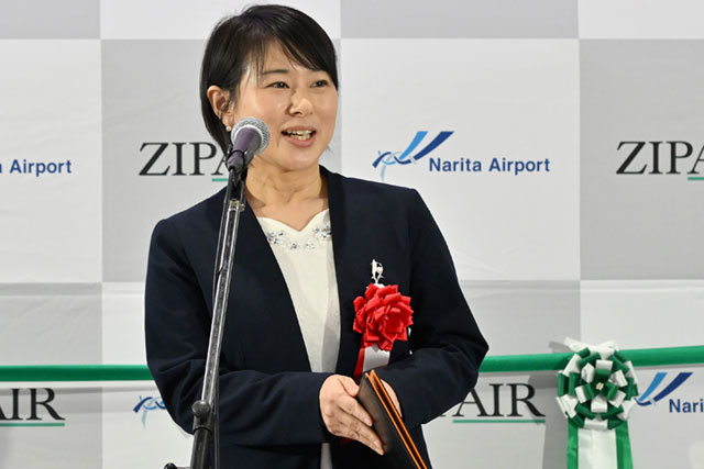 成田空港で開かれたバンクーバー線就航記念式典で挨拶する十河久惠成田空港事務所長=24年3月13日 PHOTO: Tadayuki YOSHIKAWA/Aviation Wire