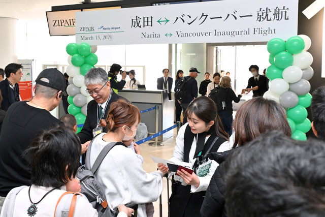 ZIPAIR(ジップエア、TZP/ZG)は3月13日、成田-バンクーバー線を週3往復で開設した。日本のLCCがカナダへ就航するのは初めてで、アジア-北米間の乗り継ぎやVFR(親族友人訪問)、留学、ワーキングホリデー、観光などの需要を取り込み、7月からは週5往復に増便する。