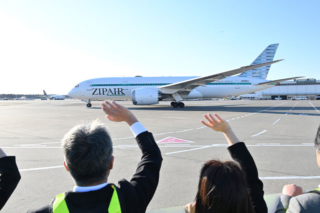 成田発初便のバンクーバー行きZG22便(787-8、登録記号JA828J)は、幼児含め乗客267人を乗せて16番スポットから午後4時10分に出発し、A滑走路(RWY34L)から同28分に離陸した。西田社長によると、初便の予約は満席だったといい、5月中頃までの予約もほぼ満席だという。