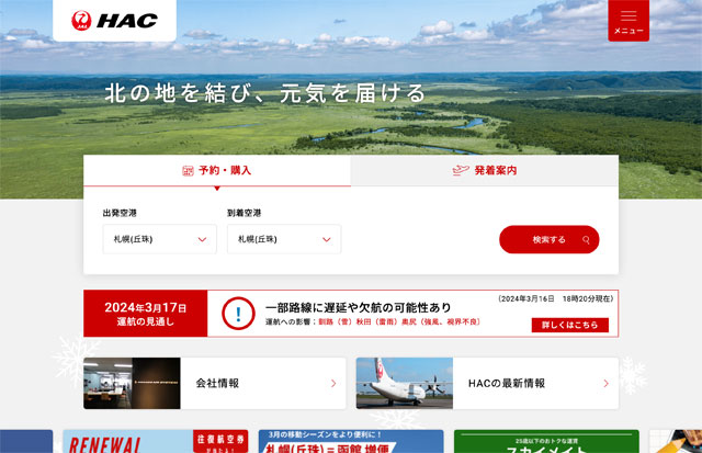 日本航空(JAL/JL、9201)グループで札幌・丘珠空港を拠点とする北海道エアシステム(HAC、NTH/JL)は、ウェブサイトを3月15日正午にリニューアルした。トップページからHAC運航路線に特化した予約ができるようにし、当日の運航状況を4段階で示すようにした。