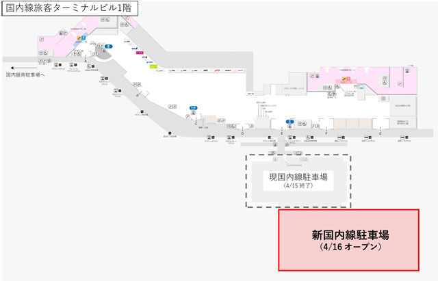 新駐車場がオープンする4月16日から、国内線駐車場の駐車料金を値上げ。30分以内の利用は従来と同様無料で、以後30分ごとに250円が基本料金となり、従来の200円から50円値上げする。24時間ごとの最大料金は1100円の値上げで、通常期がこれまでの2400円から3500円も、多客期は従来の3400円から4500円に改定する。国際線駐車場は据え置く。