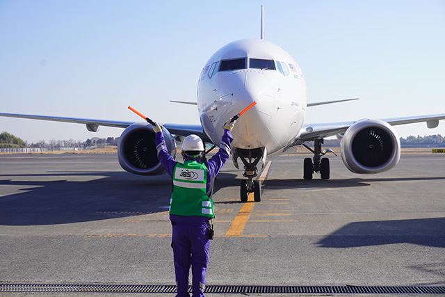 成田空港に到着するバティックエアー機を誘導するJBSのスタッフ(同社提供)