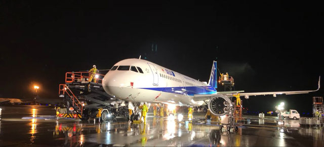 ・ANAのA380、15人掛かりで機体洗浄 初日の出フライト前に1年の汚れ落とす(21年12月27日)
