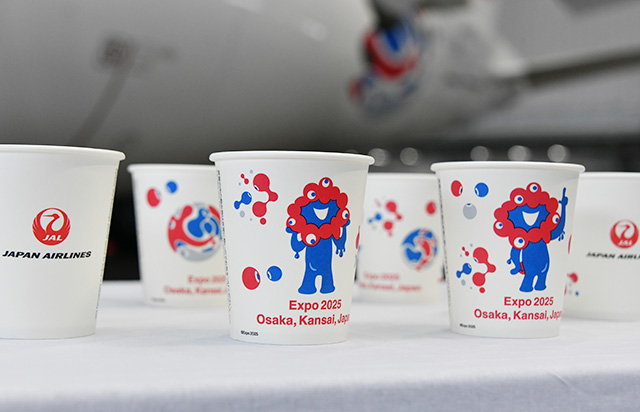 JALミャクミャクJETの機内で使用する紙コップ=24年6月2日 PHOTO: Yusuke KOHASE/Aviation Wire
