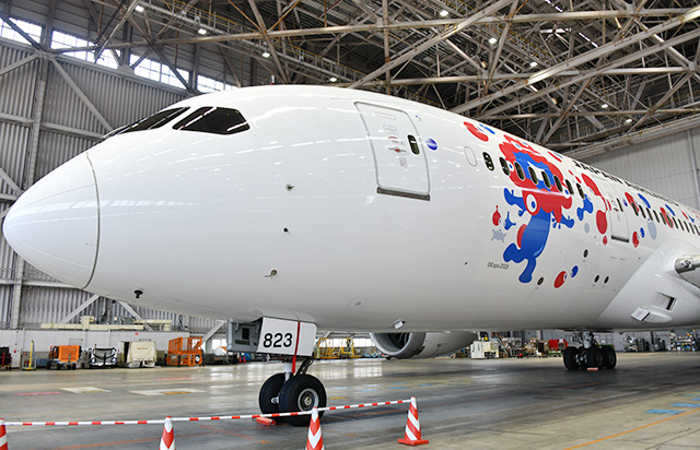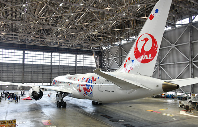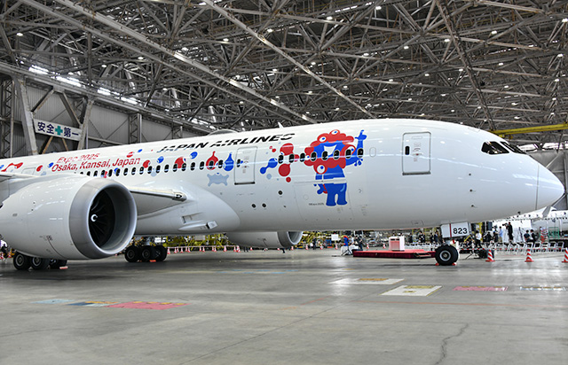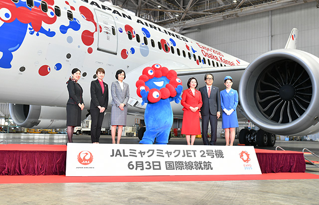 日本航空(JAL/JL、9201)は6月2日、2025年開催の大阪・関西万博(2025年日本国際博覧会)の公式キャラクター「ミャクミャク」を描いた特別塗装機「JALミャクミャクJET」の2号機(ボーイング787-8型機、登録記号JA823J)を、羽田空港の格納庫で公開した。東アジアや東南アジアなどを中心とした国際線で2025年8月ごろまで運航し、訪日客へ万博開催をアピールする。