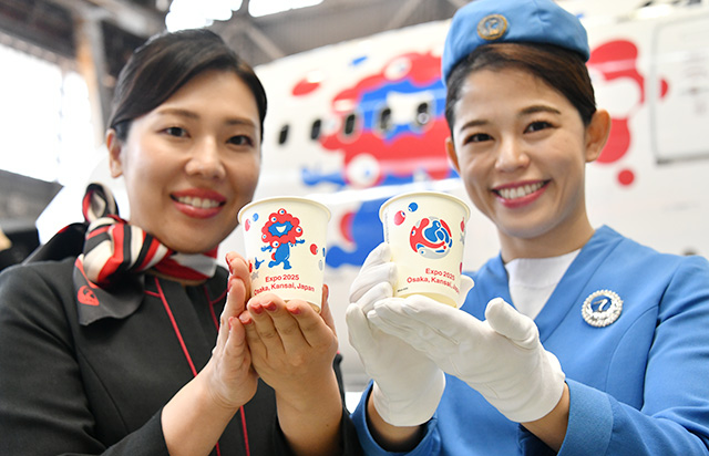 2023年11月に就航した1機目(エンブラエル190型機、JA252J)同様、2号機にも機体にはミャクミャクをはじめ、大阪・関西万博のオリジナルデザインを機体全体に描いた。機内でのドリンクサービスには、ミャクミャクをデザインした6種類の紙コップを使用する。