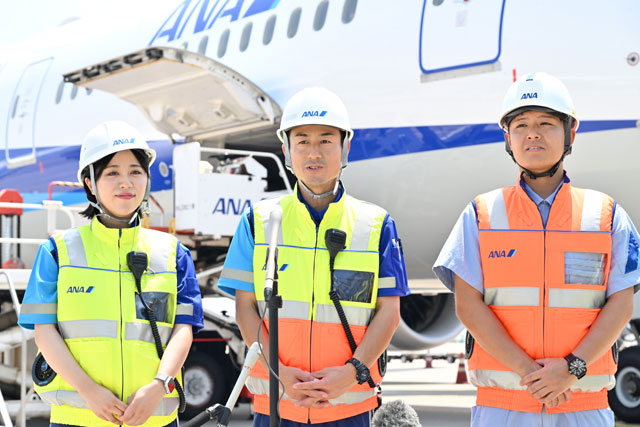 羽田空港でファン付きベストの取材に応じる(左から)ANAエアポートサービスの進元明日生さんと加藤潤一さん、ANAラインメンテナンステクニクスの小川隼平さん=24年7月4日 PHOTO: Tadayuki YOSHIKAWA/Aviation Wire