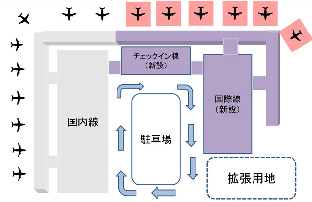 同時に、T2の改修工事にも13年度末から着手する見通し。T3と改修後のT2を合わせると、総面積は約6万3000平方メートル、スポット数は合計20スポット(小型機の場合)、年間処理能力は800万人を計画している。