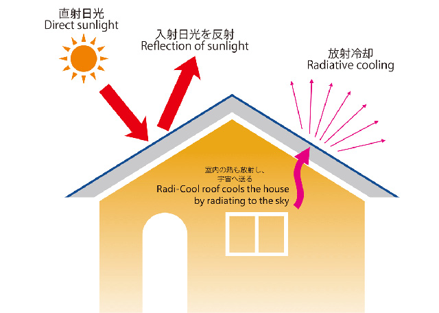 ラディクールはラディクール ジャパン社(東京・中央区)が開発。太陽光を反射し、自然現象の熱放射を用いて室内の熱も放射することで、エネルギーを使わずに室温を下げられる。フィルムと塗料の2種類あり、屋根やガラス面などで活用する。