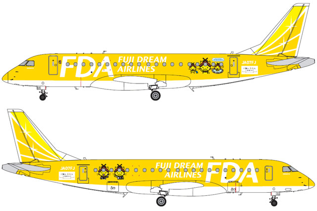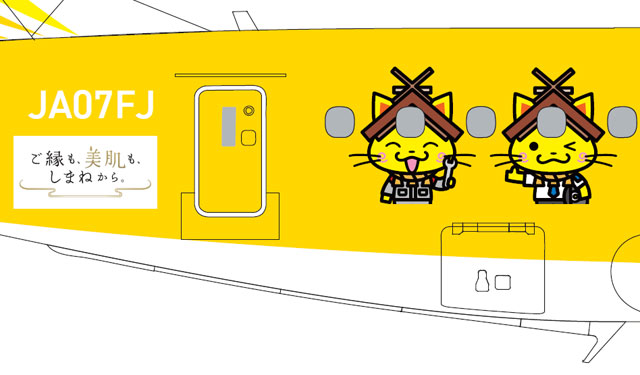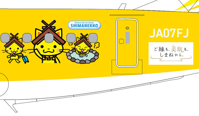 フジドリームエアラインズ(FDA/JH)は、島根県の観光キャラクター「しまねっこ」をデザインした「しまねっこ号」を9月初旬から運航する。黄色に塗装された同社の7号機(エンブラエル175型機、登録記号JA07FJ)を使用する。