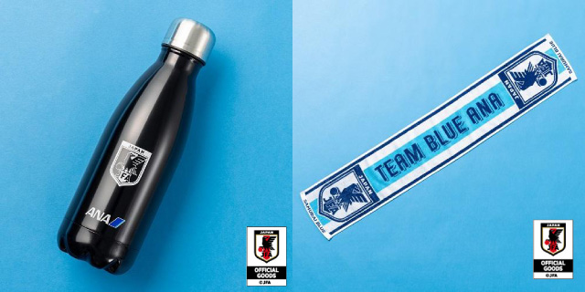 ANAが販売するJFA公認のステンレスボトル(左)とマフラータオル(同社通販サイトから)