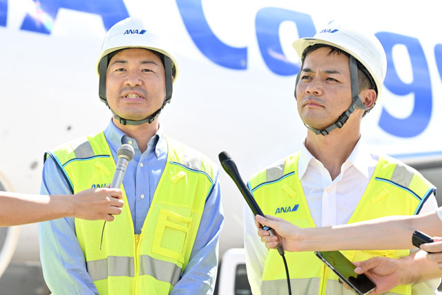 AeroSHARKについて説明するANA整備センターの松井マネジャ(左)との裙本マネジャ=24年9月2日 PHOTO: Tadayuki YOSHIKAWA/Aviation Wire