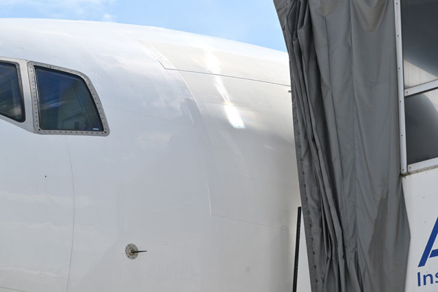 ANAの777Fの機首後ろから貼り付けられたAeroSHARK(右側)=24年9月2日 PHOTO: Tadayuki YOSHIKAWA/Aviation Wire