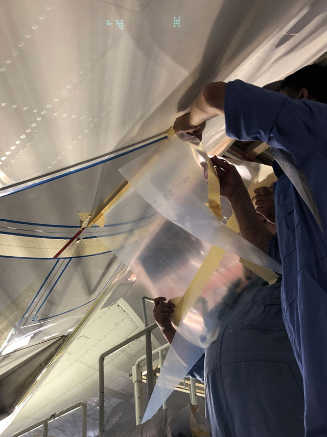 海外の整備委託先でリブレット加工フィルム「AeroSHARK」を貼り付けられるANAの777F(ANA提供)