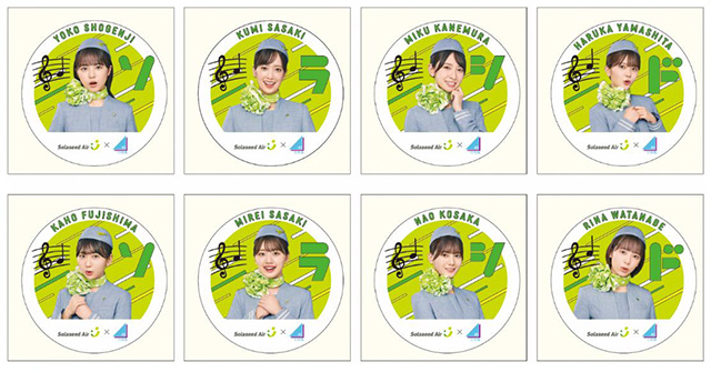 ステッカーは、ソラシドの客室乗務員に扮(ふん)した8人のメンバーを個別にデザイン。グループキャプテンの佐々木久美さんや、乗客が搭乗する際の「ボーディングミュージック」として採用したシングル『ドレミソラシド』でセンターを務めた小坂菜緒さんら8人をあしらう。冬ごろから機内で配布を始め、8種類をランダムでプレゼントする。配布期間は後日発表する。