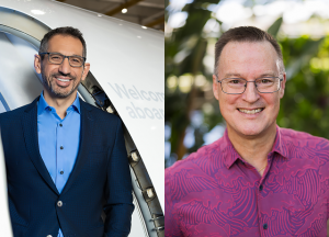 アラスカ航空のミニクッチCEO(左)とハワイアン航空の新CEOに就任するスプレイグ氏(アラスカ航空提供)