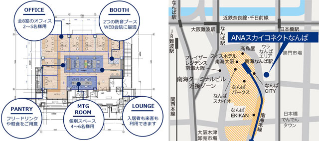 ANA WORK CABINのレイアウトとANAスカイコネクトなんばへのアクセス(ANAファシリティーズの資料から)