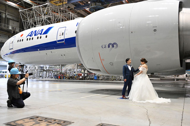 羽田空港のANA格納庫で行われたウェディングフォトの撮影=24年6月 PHOTO: Tadayuki YOSHIKAWA/Aviation Wire