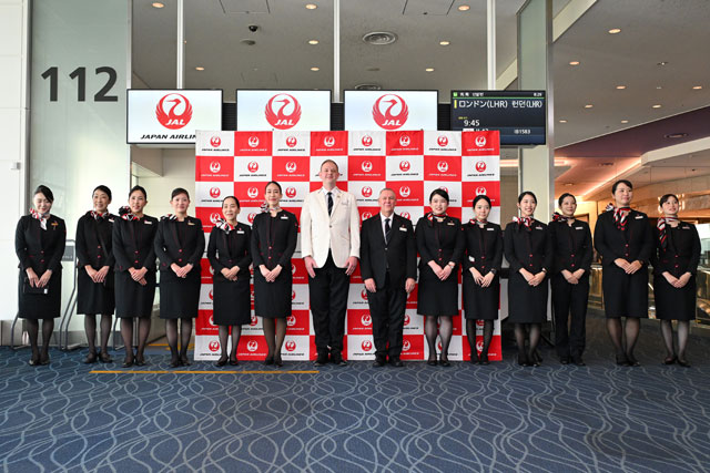 羽田空港112番ゲートに並ぶJAL A350-1000によるロンドン線初便ロンドン行きJL43便の客室乗務員=24年10月24日 PHOTO: Tadayuki YOSHIKAWA/Aviation Wire