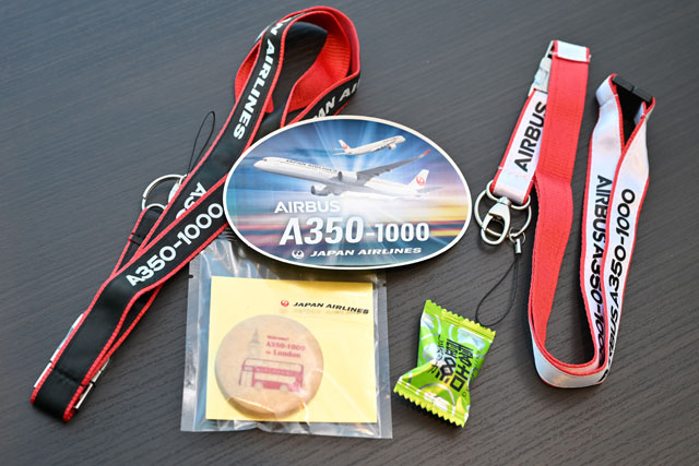 JALのA350-1000ロンドン線初便羽田発JL43便の乗客にプレゼントされた記念品。ストラップは白黒2種類でどちらかひとつが袋詰めされた。榮太樓飴(中央右下)は24日からファーストとビジネスクラスで数量限定配布=24年10月24日 PHOTO: Tadayuki YOSHIKAWA/Aviation Wire