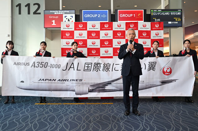 A350-1000ロンドン線投入初便JL43便出発前に羽田空港112番ゲートで横断幕を掲げるJALの余宮一郎副支店長ら=24年10月24日 PHOTO: Tadayuki YOSHIKAWA/Aviation Wire