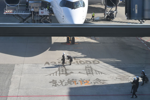 駐機場では機体のそばにグランドスタッフが、就航にちなんだ「水アート」を描き、乗客がA350-1000に搭乗後、各席の個人用モニターから機体のカメラ映像を通じて楽しめるようにした。